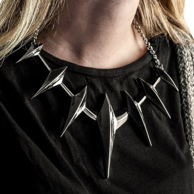 This officially licensed Black Panther adult costume cosplay necklace is designed after the necklace on King T'Challa's Black Panther costume. Zinc Alloy, one size fits most, 9" x 5" plus chain drop with toggle clasp closure. Normal Price: TT$249.99
